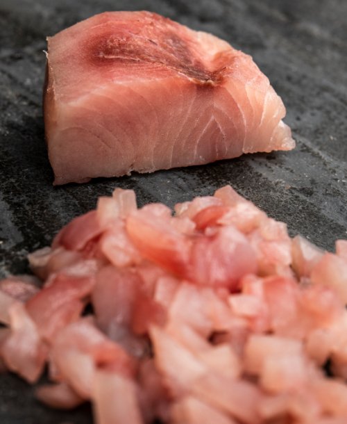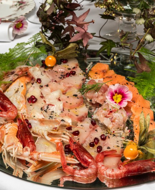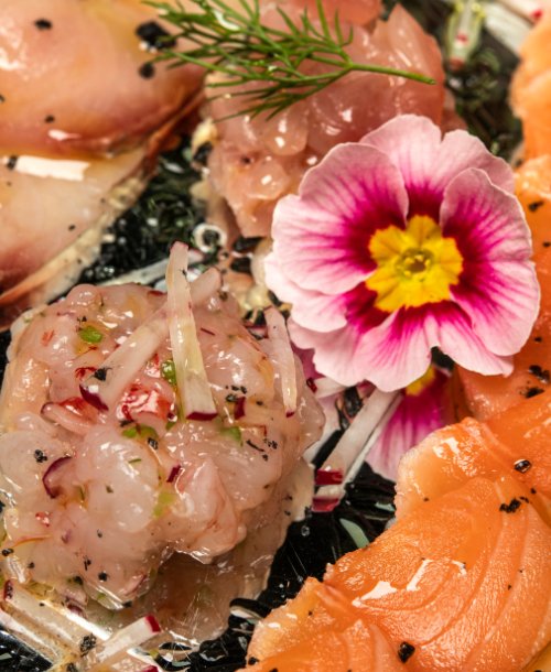 Degustazione di crudo reale con scampi, gamberi viola, lampuga, tonno bianco alalunga, salmone, luna real, accompagnati da pan brioches fatto in casa